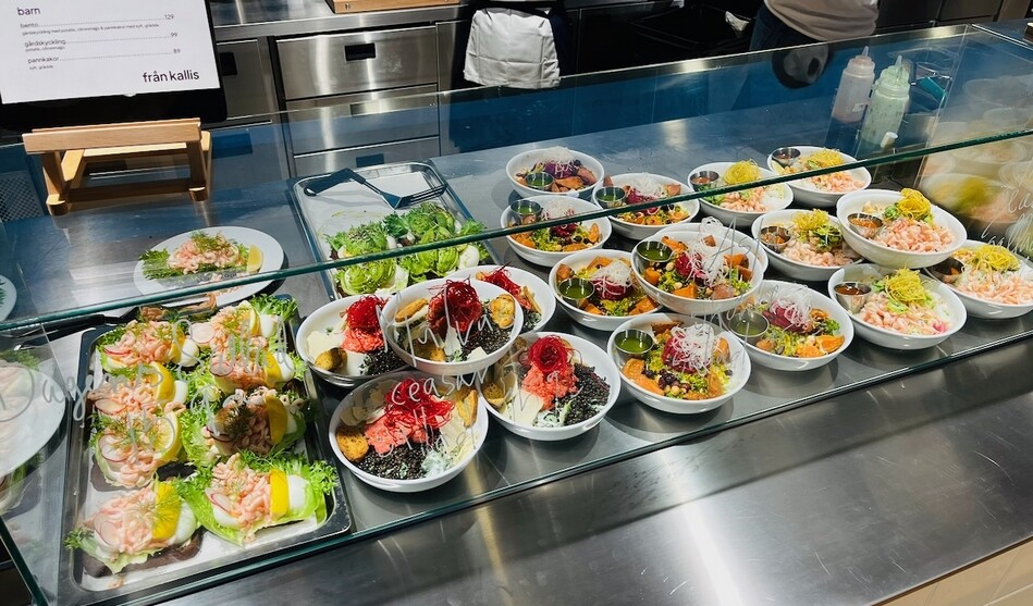 Menyn består främst av lättare rätter som sallader, mackor och enklare varmrätter.