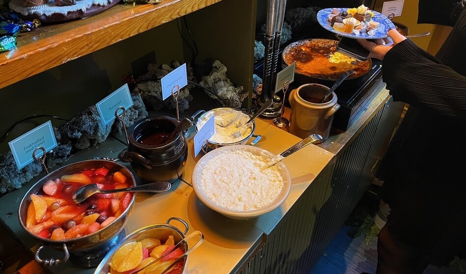 Typiska maträtter: Gravad lax, Najadlax, Skagenröra, Ägghalvor med majonnäs och räkor, Ägghalvor med löjrom, Janssons frestelse, Köttbullar, Prinskorv, Julkorv, Rökta revbensspjäll, Apelsingriljerad julskinka, Varmbakad leverpastej, Hjortkorv med grönpeppar, Vildsvinssalami, Rökt lammstek, Gräddstuvad grönkål, Brysselkål med saltrostade solroskärnor, Rödbetssallad, Ris à la Malta, Chokladkaka med ganache.