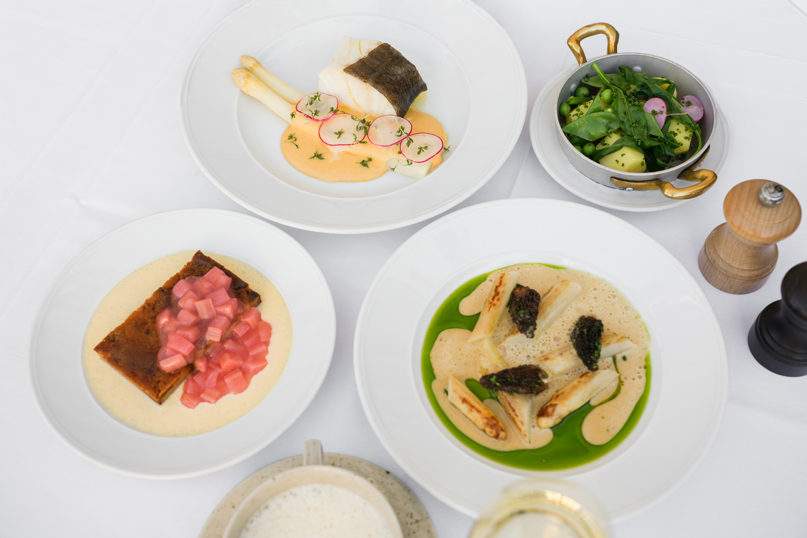 Hällstekt vit sparris, fyllda toppmurklor, ramslök och sauce suprême – 195 kr