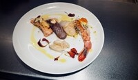 Surf & Turf “Linea 420”. Oxinnanlår · smörpocherade räkor · rocoto · kimchi-furikake.