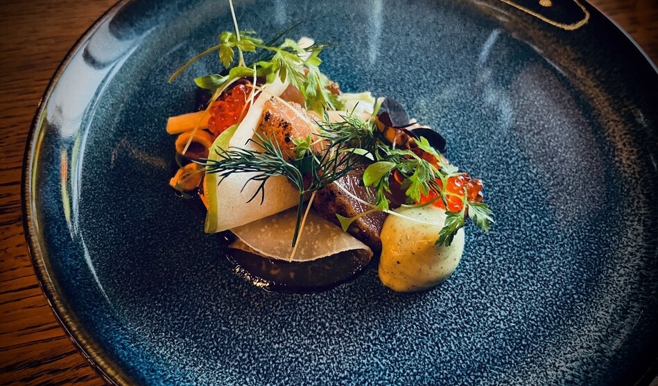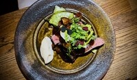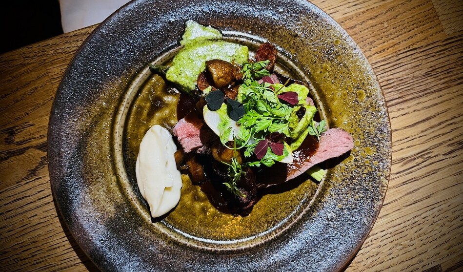 Typiska maträtter: Hängmörad ryggbiff. Persiljerot, picklad röd endiv, märg-crust, vattenkrasse. Lammrostbiff
