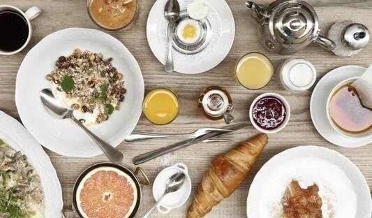 "Superfrukost" med smörgås, kaffe, juice, yoghurt och ägg